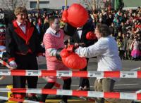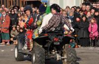 Tanzende große und kleine Räuber/Innen überfielen anschließend den Marktplatz, um dem Kaiser die Schatzkiste zu rauben und die Zuschauer/Innen mit einem Tanz zu begeistern. Das Spektakel hatte sich der Breisacher Damenzunftrat einfallen lasssen. Extrem unsportlich fählte sich sicher so mancher Narr bei der Lara- Croft- Show der Förderriege des TV- Breisach. Und auch die Ägypterinnen von „Tanz und Bwewegung“ riefen rhythmisch ins Bewußtsein, dass man ohne Sport schnell zur Mumie verkommt. Unter der Leitung von Ramona Schmidt zeigten die Brisacher „Kläpperle Buebe“, unter denen übrigens auch Mädchen sind, das ma mit zwei Holzbrettchen klappern und dabei gleichzeitig tanzen kann. Die „Gaukler- Kinder“ zeigten bei ihrer Einradshow „Punker und Rocker“, dass auch junge Narren schon voller Opferbereitschaft zur Sache gehen. Zwei der beteiligten Mädchen radelten mit Gipsarm! Einen Ausflug in den Osten Europas machten die Panduren aus Hochstetten bei ihrer Aufführung „Tanz der Geigen“. Die Guggenmusik „Schädelfätzer“ zeigte zum einen, dass schräg auch schön sein kann und zum anderen, dass man sich bei der Männergugge keine Nachwuchssorgen machen muss. Der Dirigent des Auftritts war nämlich kaum größer als eine Trompete. Klassiker aus dem Kultfilm der 80er Jahre lieferten die „Blues Brothers“ der „Rhiwaldhexen“. Anschließend kämpften die „Brysacher Hofnarren“ erst mit Flatterbändern und dann mit Boxhandschuhen. Allerdings ging so mancher Zuschauer schon beim Anblick des Nummerngirls k. o.! Atemberaubend war der Auftritt des Motorrad- Artisten Mike Auffenberg aus Thüringen, der bereits im vergangenen Jahr gezeigt hatte, wie es aussieht, wen jemand wirklich Motorrad fahren kann. Den Höhepunkt seiner PS- Show bildete der Sprung über ein mit mutigen Hofnarren besetztes Riesenquad. Gefühlt 1000 bunte Clowns bevölkerten anschließend den Platz. Wie es Sabrina Mastrocola gelungen ist, mit der vielköpfigen Rasselbande einen Tanz einzustudieren, bleibt ihr Geheimnis. Allein das Nähen der Kostüme muss Jahre gedauert haben. Der langen Tradition der Fasnacht in Breisach war das Narrennest „Algerio“ auf die Spur gekommen. In einer Steinzeithöhle hatten sie mit Hilfe von Stadtarchivar Uwe Fahrer den Urnarren entdeckt.