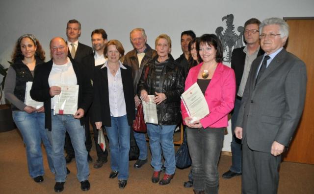 Oliver Rein (3. v.l.), Joachim Krause und Josef Köninger (2. und 1. v. r.) ehren Mehrfachblutspender/Innen (Bild: J. W. Steckmeister )