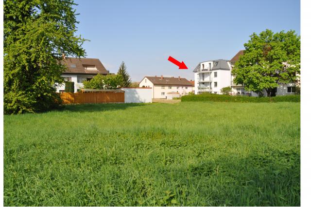 In Breisach bald überall in Sichtweite: Eine Stadtvilla (Pfeil) mit Baulücke (Wiese) auf die eine Stadtvilla kommt (Bild: J. W. Steckmeister)