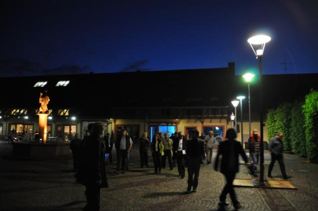 Damit sich alle Anwesenden das Ganze besser vorstellen konnten, verließ man geschlossen den Bürgersaal, um sich zu einer Licht- und Lampendemonstration auf dem Gutshofplatz einzufinden. Dort gab es neben den vier Mastleuchten bestrahlte Bäume, Brunnen und Bänke zu bestaunen. Hinter der Arkaden- Hecke lauerte noch eine besondere Überraschung: Die intelligente LED- Hightech- Mastlampe „Elsta“, die nur darauf brannte, ihre überragende Intelligenz unter Beweis zu stellen. Während Versuchskaninchen Walter Laub mutig unter die erste „Elsta“- Lampe trat, schalteten sich diese und danach auch ihre zwei Kolleginnen ganz von selber ein! Etliche unschuldige Spaziergänger konnten diese Sensation unter den Augen der versammelten Begutachter ebenfalls erleben. Nach der Rückkehr in den Bürgersaal hatte sich auch ein Vertreter der Firma „Luxsoni“, Hersteller der Wunderlampe, an den Rednertisch gesetzt, um die Anwesenden von den Vorzügen der ebenso wartungsarmen wie energieeffizienten LED- Technik zu überzeugen. Jörg Kandzia (CDU) wollte wissen, ob es die Lampen auch in „verspielt“ gäbe, denn „Elsta“ erinnere ihn an den Rangierbahnhof in Maschen. Diese Anfrage musste jedenfalls von Seiten der Firma „Luxsoni“ verneint werden, da die LED- Technik noch nicht so weit ausgereift sei, dass alle Lampenformen möglich wären. Das wiederum machte Ilias Moussourakos (UBU) stutzig. Zwar ist er bekennender Ortskernneugestalter und war von dem Licht-Zeitkonzept auch durchaus angetan, hielt es jedoch für riskant, als Testkandidat für die noch junge Technologie herzuhalten. Carola Staffa konnte dieser Meinung am Beispiel ihrer nahezu neuen aber funktionsuntüchtigen Hightech- Armbanduhr nur zustimmen. Wolfgang Risch (FWU) befand die Technik der Lampe für „super“ und auch mit ihrem Anblick könne er gut leben. Vom Rangierbahnhof war auch Kandzia inzwischen auf die „überzeugende Schlichtheit“ von „Elsta“ gestoßen. "Am Tag sieht man die Lampen eh nicht an", so Roswitha Heitzler. Auch sie sei für Neues offen. Da in Sachen „Elsta“ also technisch wie optisch dennoch weiterer Annäherungsbedarf bestand, wurde die Entscheidung vertagt und  das Gremium stimmte nur über die ersten drei Beschlussvorschläge ab. So wurde das Beleuchtungskonzept einstimmig angenommen, die Mittel in Höhe von 75. 550 Euro ebenso einstimmig bewilligt und der Vertrag mit dem Atelier Kontrast unter Enthaltung von Tom Hirzle (undurchsichtiges Pauschalhonorar der Lichtkünstler) und Christian Bölter (beide SPD) beschlossen. In Sachen Gutshofneugestaltung scheint die Wunderlampe wohl auch fast ein solches vollbracht zu haben, denn die Gemeinderätinnen und -räte wirkten zwar gewohnt kritisch aber durchaus auch mutig und aufgeschlossen. Vielleicht ist ja an dem Abend so manchem ein Licht aufgegangen!