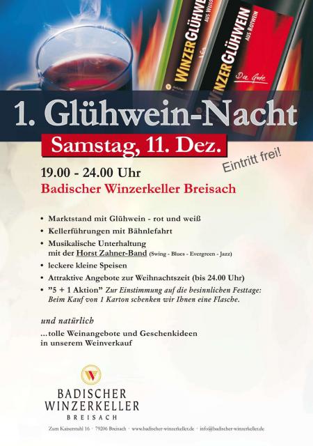 Im Rahmen der neuen Veranstaltungsreihe „Kulinarischer Advent“ finden in Breisach zahlreiche Premieren statt. Neben dem „1. Breisacher Kochvergnügen“, Springerle- Backwerkstatt und Glühweinspaziergang, hat sich auch der Badische Winzerkeller etwas Vorweihnachtliches einfallen lassen. Frei nach dem Motte des Billy- Wilder- Klassikers „Manche mögen´ s heiß“ findet im BWK am Samstag, den 11. Dezember von 19.00 - 24.00 Uhr die „1. Glühwein- Nacht“ statt.