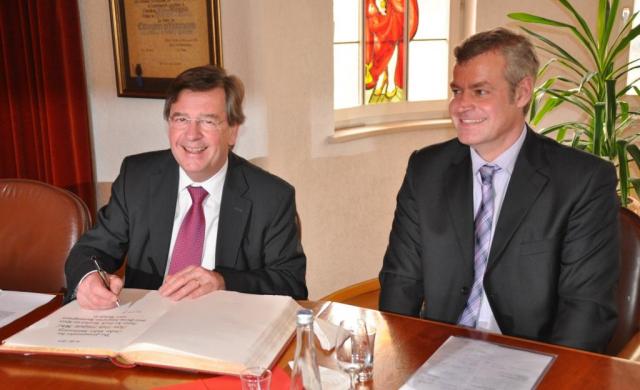 Eintrag ins Goldene Buch: Finanzminister Willi Stächele und Breisachs Bürgermeister Oliver Rein (v.l.n.r.) (Bild: J. W. Steckmeister)