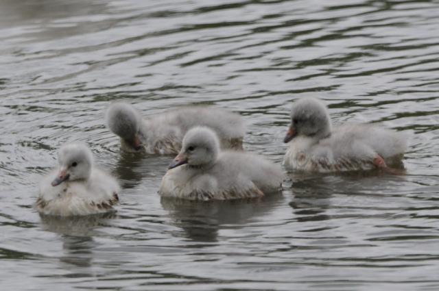 Schwanengeburt: Vier junge Singschwäne in Umkirchs Queen-Auguste-Victoria-Park