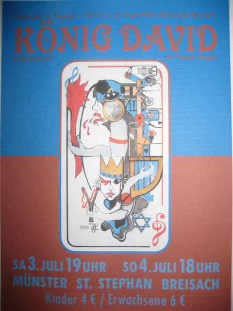 Seit vergangenem Herbst sind rund 50 Kinder zwischen 7 und 15 Jahren des Kinderchors St. Stephan Breisach und der Klasse 5c der Hugo- Höfler- Realschulemit viel Engagement und Eifer dabei, die Lieder, Texte und Rollen des Musicals "König David" einzustudieren. Am Samstag, den 03. Juli um 19 Uhr und am Sonntag, den 04. Juli um 18 Uhr präsentieren die jungen Darsteller/Innen die musikalische Frucht ihrer Mühen endlich den Zuschauern (m/w).