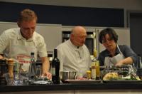 „Kochen muss aus dem Bauch kommen“, so Begyn zu Elisa Russano, die ihrem "Kohlrabi nach Sauerkrautart" mit reichlich Weißwein auf die Sprünge half. Während Ulrika Hänsler mit ansetzendem Gemüse kämpfte, höhlte Markus Baatz mit viel Feingefühl Birnen aus. Nicht Bierernst sondern eher weinselig ging es im Kochstudio aber nicht nur für Kohlrabi zu. Die Besucher plauderten angeregt, die „Kontrahenten/Innen“ prosteten sich mit Kochwein zu und auch Kochprofi Christian Begyn ließ sich von der guten Stimmung anstecken und vergaß ein Blech Lebkuchen im Backofen: Das weihnachtliche Süßgebäck war bis zur Unkenntlichkeit entstellt.
