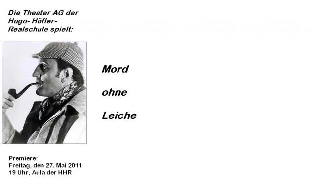 Die für Freitag, den 27. Mai 2011, 19 Uhr, vorgesehene Premiere des Theaterstücks „Mord ohne Leiche“ der Theater AG an der Hugo- Höfler- Realschule Breisach, musste leider abgesagt werden. Der neue Premierentermin wird in REGIONALIA- Breisacher Nachrichten rechtzeitig angekündigt!
