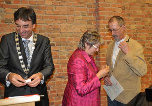 Die Nadel piekt nicht: DRK- Vorsitzende Roswitha Heitzler überreicht Blutspenderehrennadel an Uwe Lampe