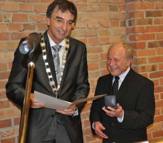 Scheut den großen Auftritt mit Amtskette: Bürgermeister Walter Laub ( hier mit Pfr. Kurt Hilberer)
