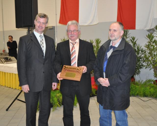 Bringt güldenes Werkzeug: Michael Fuß (rechts) mit Oliver Rein und Bauhofchef Karl- Heinz Brückner