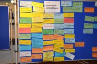 In der Schlussrunde, wieder vor dem großen Plenum, wurden diese nun mit Hilfe weiterer bunter Kärtchen, Wölkchen oder bloß hingeschrieben vorgestellt. Lediglich die Tafel des Arbeitskreises Wirtschaft& Schule war unbeschriftete und -beklebt geblieben. Statt zu basteln, hatte man beschlossen, sich bereits Anfang Mai zur Weiterarbeit zu treffen.