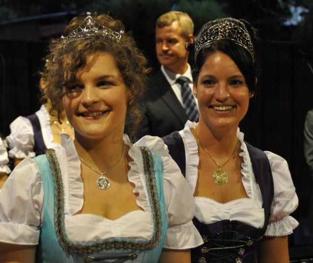 Einige einleitende Worte zum vorläufigen Höhepunkt des Abends, der Krönung der neuen Bezirksweinprinzessin, sprach anschließend die amtierende Badische Weinkönigin Marion Meyer. Schließlich wurde das Geheimnis dann gelüftet: Bei der Wahl, die erst einen Tag zuvor, am Donnerstag, den 26. August 2010, im Badischen Winzerkeller stattgefunden hatte, war es der 19jährigen Abiturientin Natalie Henninger aus Königsschaffhausen gelungen, sich gegen ihre Mitbewerberinnen durchzusetzen. Freudestrahlend nahm die neue Weinprinzessin Glückwünsche, Krone und Amtskettchen entgegen, und bedankte sich noch etwas unsicher aber vor Freude und Charme sprühend für ihre Wahl. Um für die zahlreichen Aufgaben, die ihr in den kommenden Monaten bevorstehen würden, auch mobil zu sein, gab es von Martin Ernst zum krönenden Abschluss der Zeremonie noch einen Riesenautoschlüssel für die Prinzessin. Wie auch schon im Jahr zuvor ließ es sich ein großes regionales Autohaus nicht nehmen, der Hoheit einen flotten Flitzer, einen selbstverständlich weinroten Ford Fiesta, zu Verfügung zu stellen. Mit einem Glas roten Weines endete dann auch die offizielle Eröffnung des Weinfestes. Auf dem Festplatz kann nun noch bis zum Montag weitergefeiert werden. Und auch die Wettervorhersage verspricht für die kommenden Tage zwar kühle aber weitestgehend trockene Stunden. Das komplette Festprogramm gibt es im Internet unter www.weinfest-breisach.de.