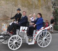 Bereits gegen 17 Uhr 15 hatten sich die ersten Ehrengäste aus Politik und Weinwirtschaft auf dem Breisacher Marktplatz eingefunden, um sich bei einem spritzigen Weißwein auf die kommenden Festtage einzustimmen. Um halb Sechs setzte sich der Festzug, angeführt vom Fanfarenzug aus Bötzingen entlang der Josef- Bueb- Straße Richtung Weinfestgelände in Bewegung. Während selbst Bundestagsabgeordneter Gernot Erler zu Fuß gehen musste, hatten es die Weinhoheiten Marion Meyer, Rebecca Gut und die scheidende Bezirksweinprinzessin Sarah Kappeler besser. Sie durften in prächtig geschmückten Kutschen auf das Weinfest fahren. Und damit es den Hoheiten unterwegs nicht zu langweilig wurde, hatte der Veranstalter ihnen männliche Begleitung zur Seite gestellt. Während Königin Meyer und Prinzessin Gut mit Breisachs Bürgermeister Oliver Rein Vorlieb nehmen mussten, hatte Sarah Kappeler das große Los gezogen: Sie durfte die Kutsche mit Stimmungskanone Tony Marshall teilen, der von zahlreichen Zuschauern am Straßenrand begeistert mit „Hallo Roberto“ - Rufen begrüßt wurde. Ein bisschen Spaß muss sein! Upps, das ist ja auch von Roberto…