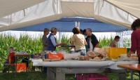 Breisachs Bürgermeister betonte bei seiner Ansprache vor der Kapelle, dass ein Fest wie das Verenenfest in Hochstetten, einen wichtigen Baustein zur Wahrung alter Traditionen darstelle. Allerdings, bekannte Oliver Rein, würde er dem Fest im nächsten Jahr gerne eine neue Tradition hinzufügen: „Ich würde das Fest gerne mal mit einem Fassanstich eröffnen!“ Das Versprechen des Bürgermeisters, besagtes Fass auch zu spendieren, wurde vom Veranstalter, dem Bürgerverein Hochstetten sicherlich zu Protokoll genommen. Die in diesem Jahr noch fasslose Festeröffnung wurde von der Breisacher Chorgemeinschaft und der Stadtmusik stimmungsvoll umrahmt. Gegen 12 Uhr war der Festplatz schon komplett besetzt, was neben der hervorragenden Bewirtung sicherlich auch daran lag, dass sich mittlerweile die Sonne durch den Morgennebel gearbeitet hatte. Vor der improvisierten (Mais-) Feldküche bildeten sich erste Schlangen und auch die Herren am Bierbrunnen hatten mächtig zu tun.