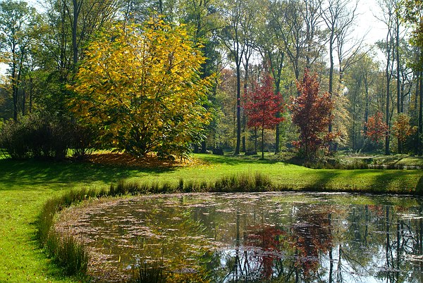 Das Herbst-Licht strahlt auf die Blätter im See des Queen-Auguste-Victoria-Park und das Wasser spiegelt die Bäume