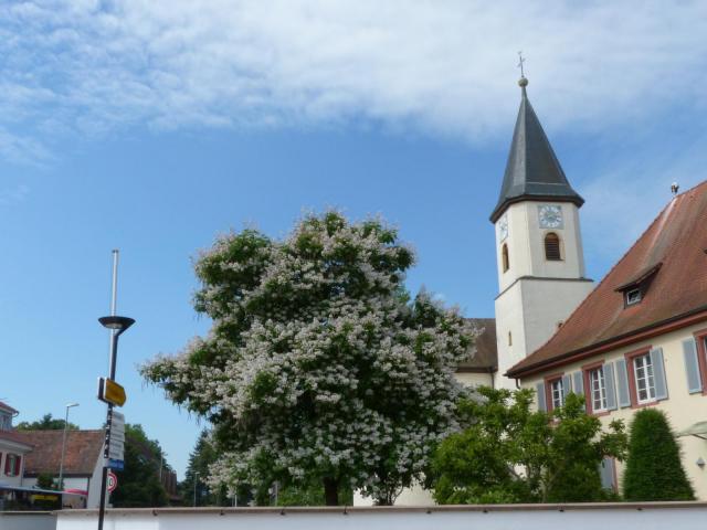 Die „Catalpa“ ist ein Laubbaum aus der Familie der Trompetenbaumgewächse (Bignoniaceae). Er stammt aus Amerika und ist mit der Migration der Natur nach Europa eingewandert. Der englische Naturforscher Mark Catesby (* 3. April 1683; † Dezember 1749) brachte den schönen Baum 1726 von Nordamerika nach Europa. Catesby veröffentlichte zwischen 1731 und 1743 sein Werk „Natural History of Carolina, Florida and the Bahama Islands“ über die Flora und Fauna Nordamerikas und schickte Samen schöner Bäume nach England. Am 26. April 1733 wurde Mark Catesby in die ehrwürdige „Royal Society“ gewählt. Auch nach ihm gab es Botaniker, die diese seltenen Schönheiten der Natur fortgepflanzt haben. In Umkirch wurden zwei verschiedene Exemplare der Catalpa in den fürstlichen Schlosspark gesetzt. Der ehemalige fürstlich-hohenzollerische Hofgärtner Rudolf Efinger zog aus einem der Altbäume, der alljährlich durch seine überragende Blüh-Freude bezaubert, junge „Baum-Kinder“. Zur Fortpflanzung und zur Bewunderung durch künftige Generationen verschenkte er ein Exemplar für den Pfarrgarten der katholischen Kirchengemeinde und ein Exemplar für den Queen-Auguste-Victoria-Park. Die Fortpflanzung der seltenen Baum-Schönheiten ist gelungen. Unser Foto zeigt die erwachsen gewordenen Bäume während ihrer Blüte im katholischen Pfarrgarten, am Wernersee und am Augustenbächle im Queen-Auguste-Victoria-Park in Umkirch. Parkschöpfer Werner Semmler ist in seinem Park besonders stolz auf seine sogenannten „Gold-Bäume“. Das sind Bäume, die im Frühjahr goldgelb austreiben. Deswegen hat er im Park auch die Sonderform „Catalpa Aurea' eingebürgert, die im Frühling „goldgelbe Akzente“ in seinen Park setzt.