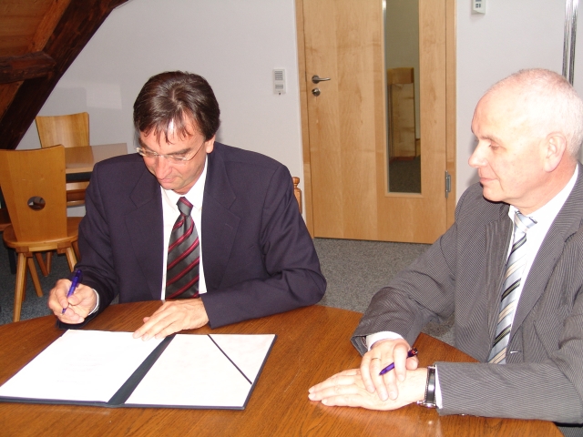Bürgermeister Walter Laub (links) und Badenovas Vorstandsmitglied Mathias Nikolay unterzeichnen den Gesellschaftervertrag. (Bild: K. Wortelkamp)