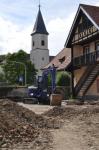 Erscheint Umkirch also künftig, mittels Fehl-Lieferung, im Grau-Look von Platzplaner Volker Rosenstiel? Die kühle Moderne erschlägt die alte Gutshofsmitte um den Marienbrunnen? Vielleicht ist der weißgraue Bodenbelag ja Rosenstiels Rache für die neu in die Lampenbemusterung geratenen gusseisernen Altstadtlampen. Der Kampf „Moderne“ gegen „Mittelalter“ geht also in die nächste Runde.