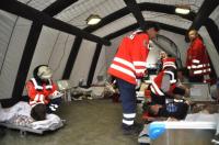Ein ganzes Dorf, das militärische Übungsdorf „Lanouville“ nahe Hartheim nämlich, war durch einen imaginären Stolleneinbruch unter der Siedlung zum Katastrophengebiet geworden, so das zweite Übungsszenario. Neben dem Ausfall der Strom- und Wasserversorgung galt es Personen mit Drehleiter oder Rettungsseilen und Kletterern aus großer Höhe zu bergen, in Schutzkleidung einen lecken Ammoniakbehälter zu verschließen, Vermisste zu suchen und Brände zu löschen. Da es im Dorf laut Lagevorgabe kein Wasser mehr gab, musste für die Löscharbeiten der zahlreichen Brandherde zunächst eine 1, 2 Kilometerlange Wasserförderstrecke vom Rhein bis ins Dorf aufgebaut werden. In einem mobilen Lazarett wurden die Verletzen eingeliefert und von Sanitätern/Innen und Notärzten/Innen erstversorgt.