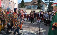 Im Eingangsbereich wurde dem ehrwürdigen Breisacher Rathaus durch fleißige Narrenhände schon mal „ein neues Gesicht verabreicht“, bevor der bestürzte Bürgermeister, aufgeschreckt durch bunte, schunkelnde Menschenmassen, aus dem Rathausfenster spähte. Zunächst befürchtete das Stadtoberhaupt eine neue Bürgerinitiative gegen Sonstwas, da die nörgelnden "Dagegen- Gruppierungen" im Moment im Ländle ja Angst und Schrecken verbreiten. Der Zunftrat rund um Oberzunftmeister Wilfried Meyer machte Rein allerdings rasch und reimend klar, dass es nicht um Lappalien wie die Kettengasse sondern schlicht um die Macht im Rathaus geht, die die Narren an sich zu reißen gedenken. Unterstützt wurden Meyers Machtansprüche durch zahlreiche maskierte Bürger/Innen und Rathausmitarbeiter/Innen, die offensichtlich schon die Seite gewechselt hatten. Musikalischen Nachdruck wurde dem maskierten Machtanspruch durch Musik der „Schädelfätzer“ verliehen.