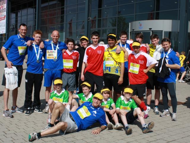 Pünktlich um 13.00 Uhr gingen die fünf Staffeln für den S`cools run an den Start. Jeweils sieben Läufer teilten sich die 21 km des Halbmarathons und übergaben an den entsprechenden Wechselstellen den Zeitnahme-Chip. Die Begeisterung war riesengroß, die Stimmung auf der Strecke prima und die Unterstützung der vielen Zuschauer beflügelte die Läufer. Die Staffel der 10c war sogar schnell genug für das Treppchen in ihrer Altersklasse.