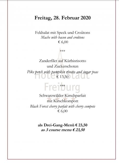 Freitag: 3-Gang-Tagesmenü von Spitzenkoch Matthias Dahlinger für EURO 23,50 im Hotel Stadt Freiburg