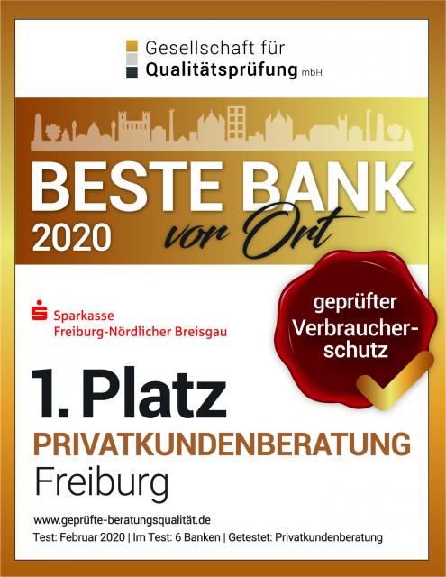 1. Platz für Privatkundenberatung: Sparkasse Freiburg wurde ausgezeichnet.