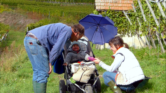 Spätburgunder-König Hubert Lay begrüßt Enkelin Felicitas bei ihrer ersten Weinlese.