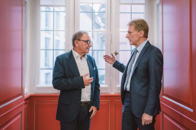 Die „Sparkassen-Kaiser“ von Freiburg im Amtszimmer von Erasmus von Rotterdam: Horst Kary und Marcel Thimm.
