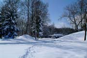 Zwei Spuren im Schnee führen durch den Queen-Auguste-Victoria-Park zum Schloss (Bild: Regionalia)