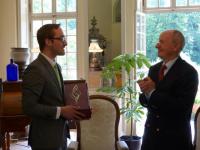 Bürgermeister Benjamin Bohn freut sich über sieben seltene Bäume von Park-Schöpfer Werner Semmler. (Bild: Benjamin Schmidt)
