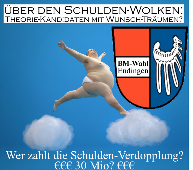 Auf dem künftigen Endinger Schuldenberg dürften die Aussichten für manches Andere auf der Strecke bleiben. Weil der künftige Bürgermeister mit diesen Schulden durch Sorgen gebunden ist, dürften sich manche jetzt geäußerten Wünsche und Programme als Illusionen erweisen und in der Praxis sterben. Deswegen stellen sich die Bürger ja auch die berechtigte Frage, ob die Kandidaten die notwendigen Erfahrungen haben, um einen gierigen Griff der Bauunternehmer auf die Kassen der Stadt abzuwehren.