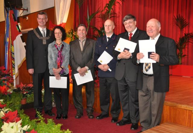 Ehrungen beim Breisacher Neujahrsempfang 2011: BM Rein mit Renate Sennrich, Bernhard Müller, Jörg Weber, Dr. Erwin Grom und Hermann Metz (Bild: J. W. Steckmeister)