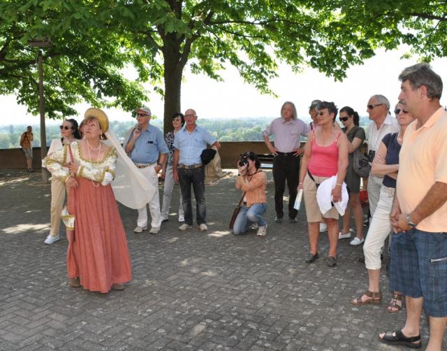 Heiß ist es vor dem Gebäude der Breisach Touristik am Marktplatz. Aber Freifrau Ursula von Pforr ist eine echte Dame ihrer Zeit und trägt ihr warmes Renaissance- Gewand mit Würde und Kopfbedeckung. In Zusammenarbeit mit Stadtarchivar Uwe Fahrer hat Marlene Müller, die Grande Dame der Breisacher Gästeführerinnen, die Patrizierin aus dem Breisach des 15. Jahrhunderts wieder auferstehen lassen, um in historischem Gewand geschichtsinteressierten Gästen die Ereignisse in der Stadt Breisach rund um die Hinrichtung des Landvogtes Peter von Hagenbach näher zu bringen. Und mit knapp 30 Mann und Frau im Gefolge, geht es denn auch gleich ab in die Vergangenheit.