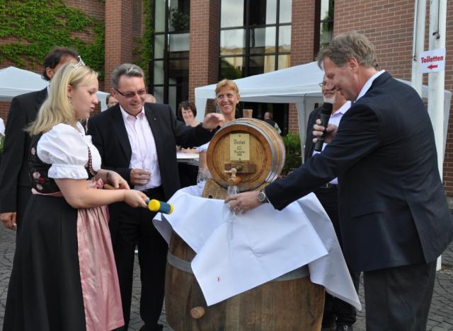Im Fass ist Wein! Eröffnung des 3. Winzerfestes mit Weinprinzessin Sarah Kappeler und BWK- Vorständen Wilfried Dörr und Axel Hahn (Bild: J. W. Steckmeister)