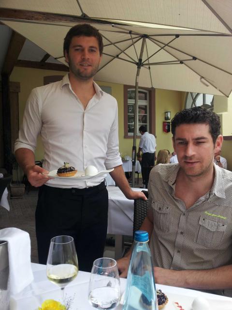 Christian Massute serviert Schauspieler Adam Sikora das Steinbuck-Dessert. (Bild: Regionalia)